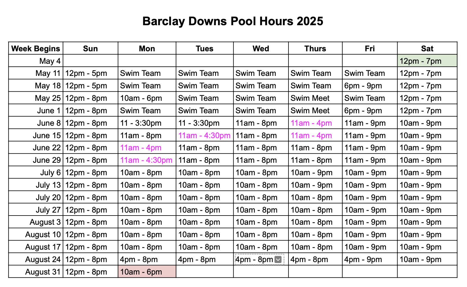 POOL HOURS Pool Hours: Summer 2025 2025 Pool Hours PDF View Calendar POOL 704-679-3906 TENNIS 704-560-4200 Member Login